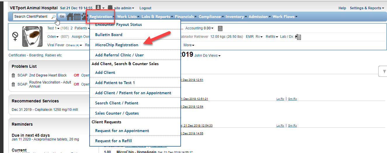 1) Performing the Plan will place the Microchip in the queue for processing. A provider is responsible for posting the registration by Web Services as a batch daily or on a schedule determined by the clinic. To post the registration please go to Registration >> Microchip Registration.