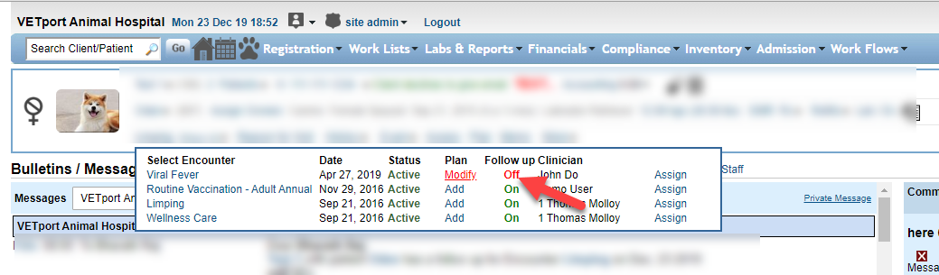 Follow Ups can be set for a an encounter. These follow ups post messages to the assigned Clinic Doctor/Staff.