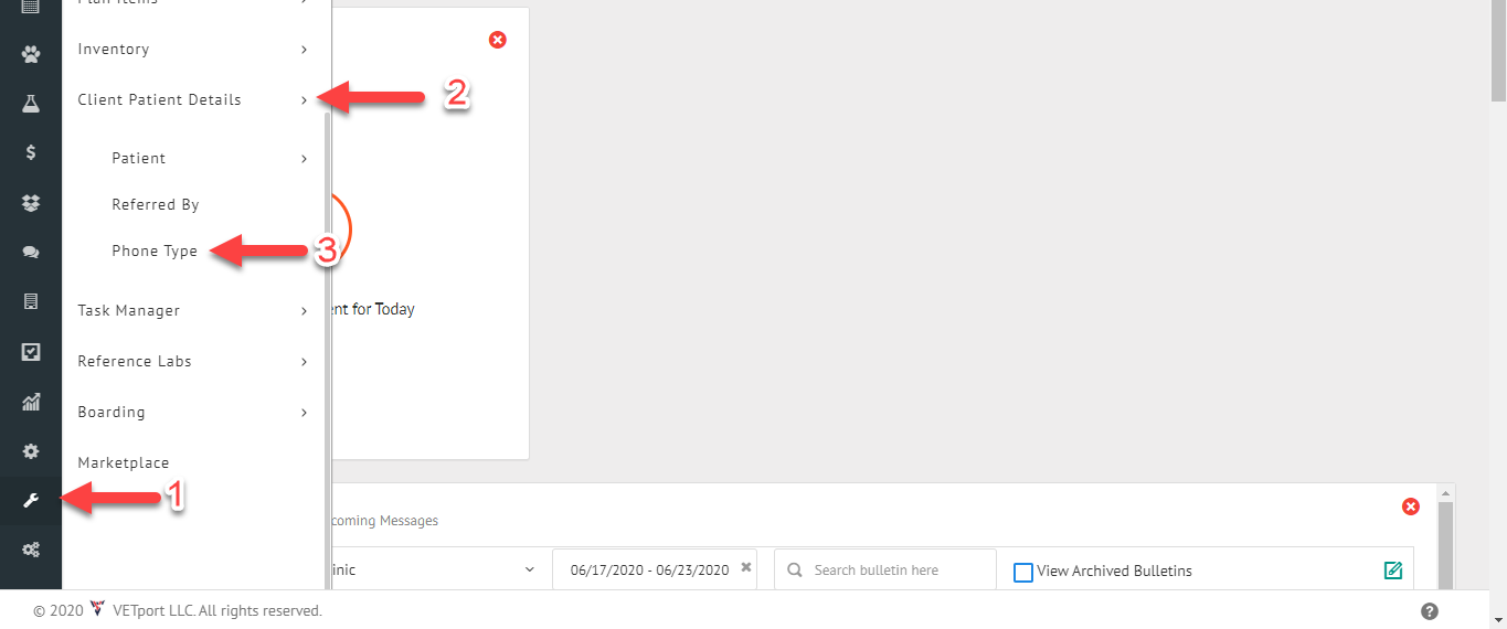 1) Please click on the setup icon as shown below. Navigate to Client Patient Details and phone type.