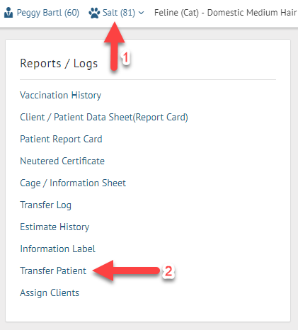Note: Once the patient is transferred, the Medical records, Reminders and Appointments will be transferred as well, however the Invoice created Under the old client for the pet will not be transferred to the new Client.