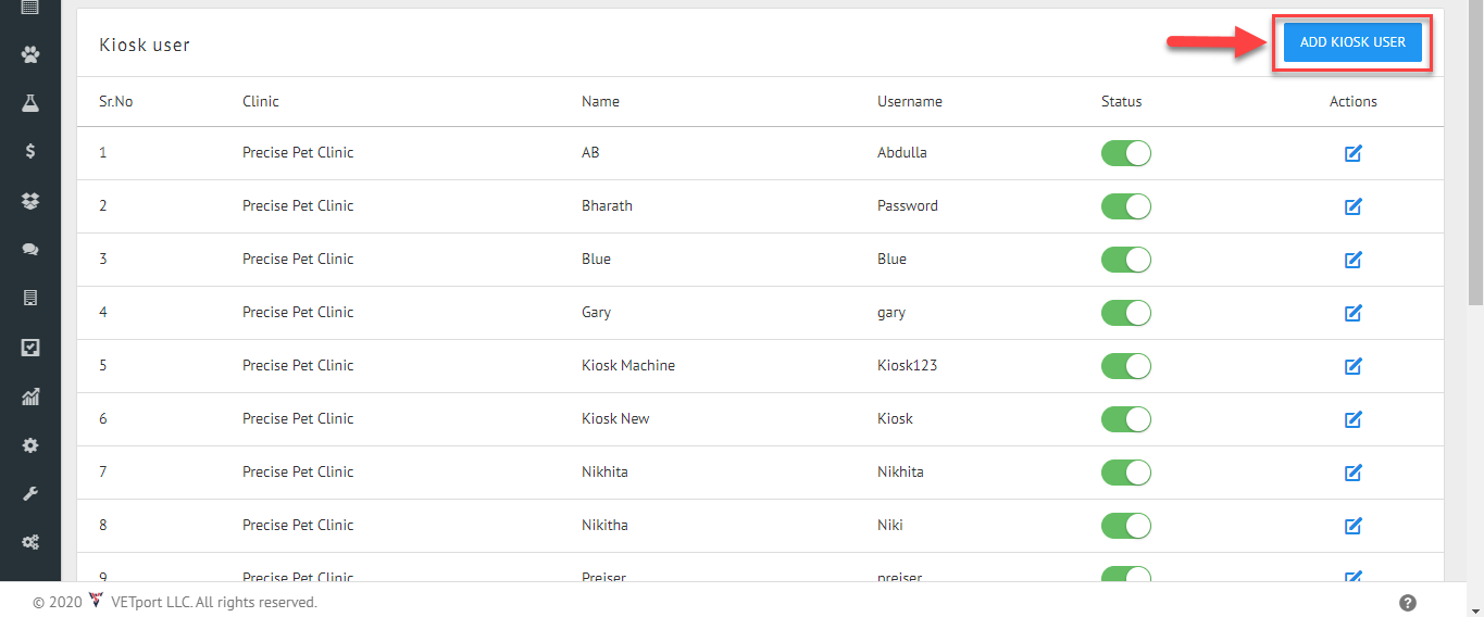 Kiosk Registration Step 1: Select "Setup" Step 2: Select "Organization" Step 3: Select " Kiosk Logins" Step 4: Select "Add Kiosk User" Step 5: Select "Clinic" for which you need the kiosk user id to be created. Step 6: Create now by filling up the ...