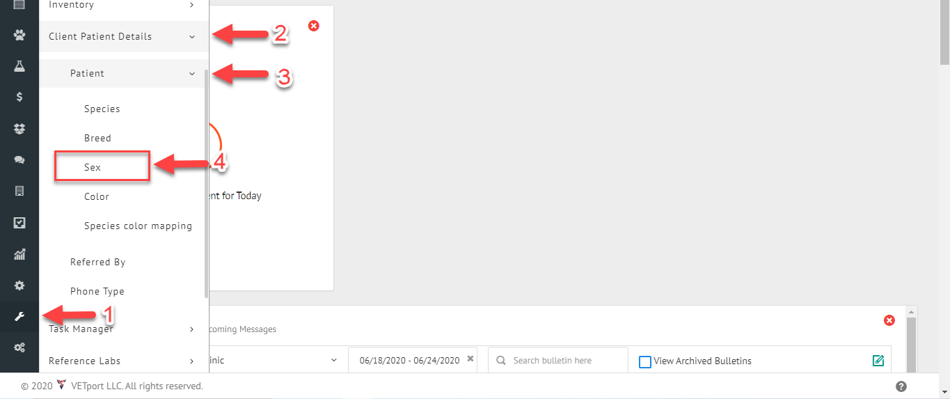 1) Please click on the setup icon as shown below. Navigate to Client Patient Details then Patient. Click on Sex.