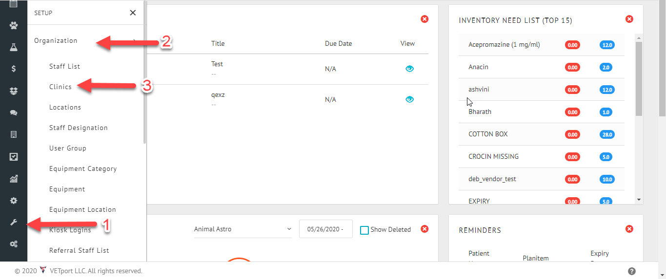 1) Click on the setup icon as shown below. Navigate to organisation then click on clinics. A > Click on Setup. B > Click on Organization. C > Click on Clinics. 2) Click on the Settings icon as shown below against the clinic you would want to make the ...