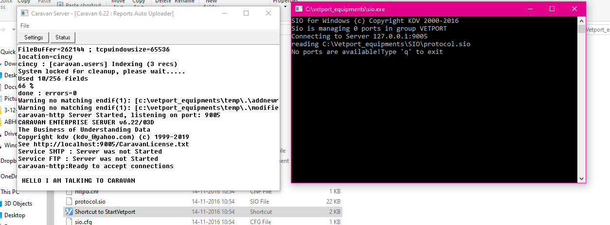 It is seen that even if the serial ports are configured for specific ports, the equipment can be replugged to some other ports or new equipments are added to new ports. In that case, please RESTART both Caravan and SIO applications. These applications will automatically recognize new serial ports and all you need to do is reconfigure the serial ports via 127.0.0.1:9005/portman.html