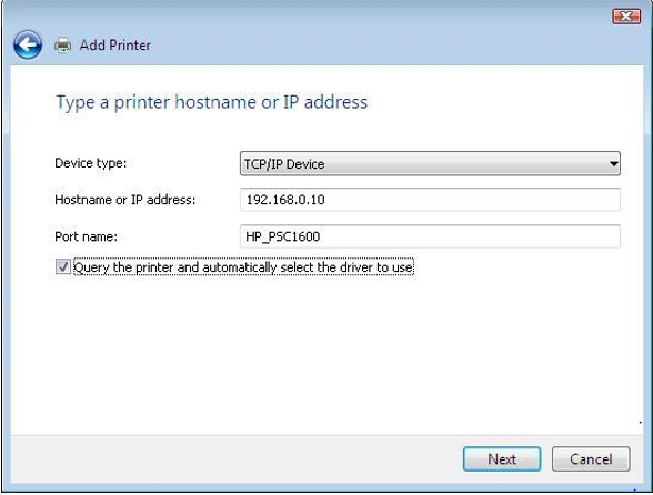 In the Hostname or IP Address field, input the ip address of your print server. (The default address for most D-Link's print servers is 192.168.0.10).