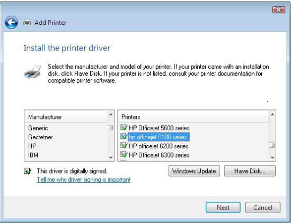 Step 12 In the left window you have a list of manufacturers, and on the right side you have the various models Select the model that pertains to your printer. Click Next.